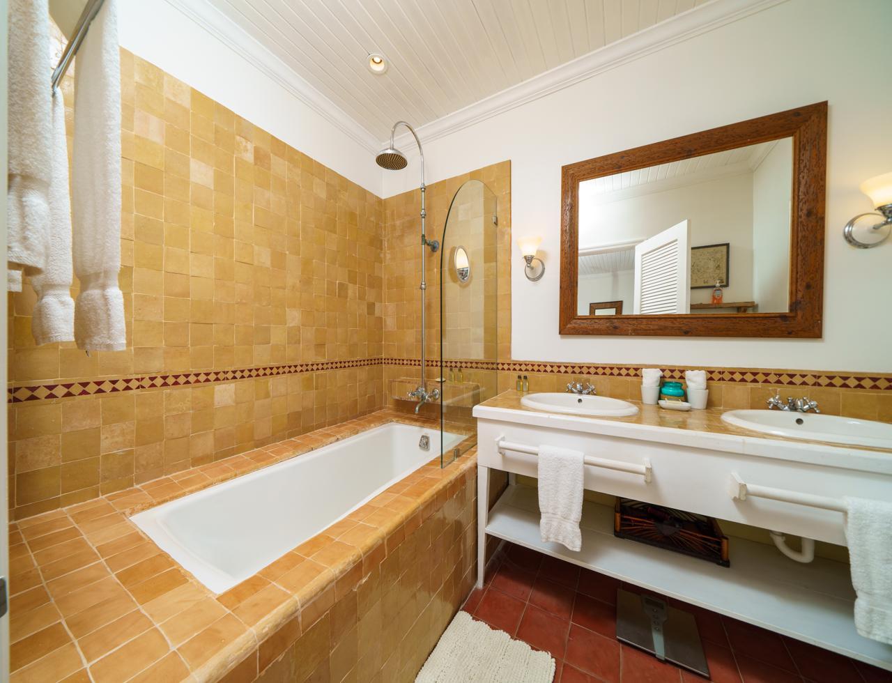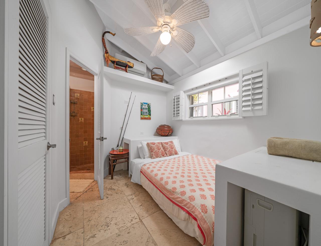 The grand main house is tastefully decorated in shades of coral, beige, and off-white, featuring 4 bedrooms and 3 bathrooms. Upstairs, three bedrooms open to a covered balcony through elegant French doors. The master bedroom boasts a king-sized bed, en-suite bathroom, and double sliding glass doors leading to a terrace with picturesque bay views.