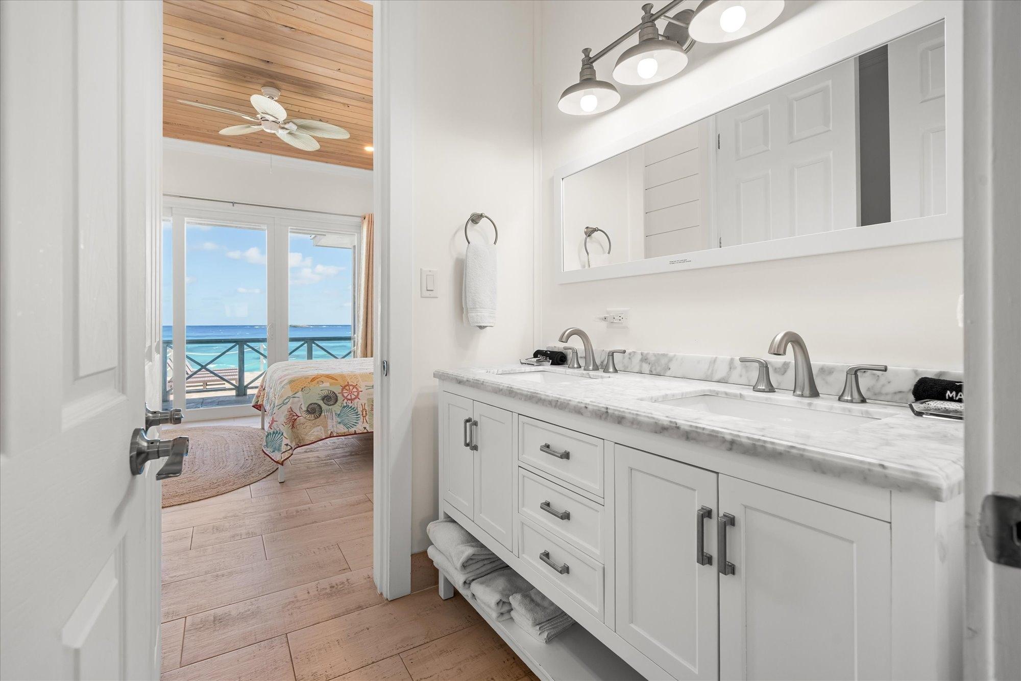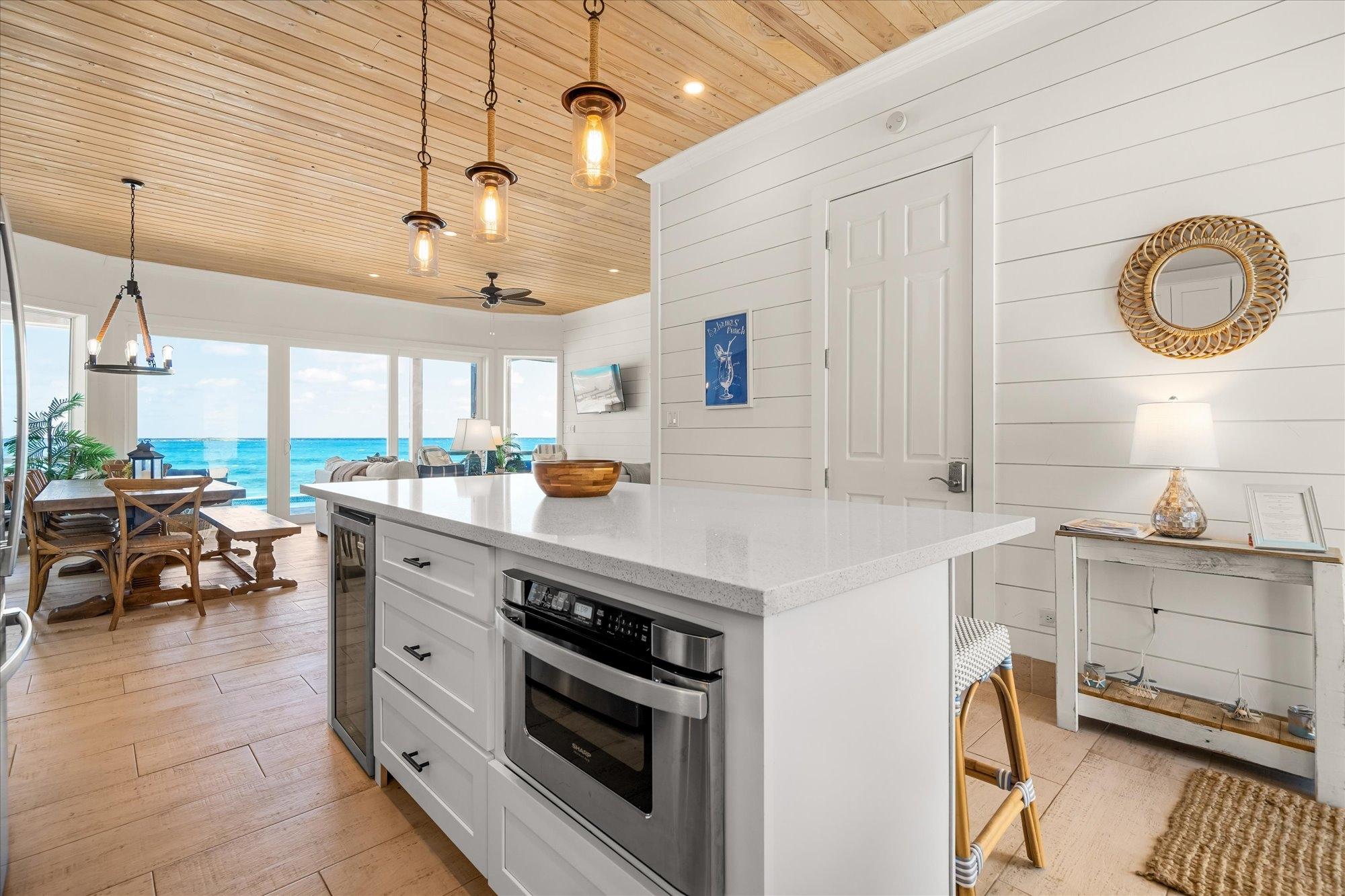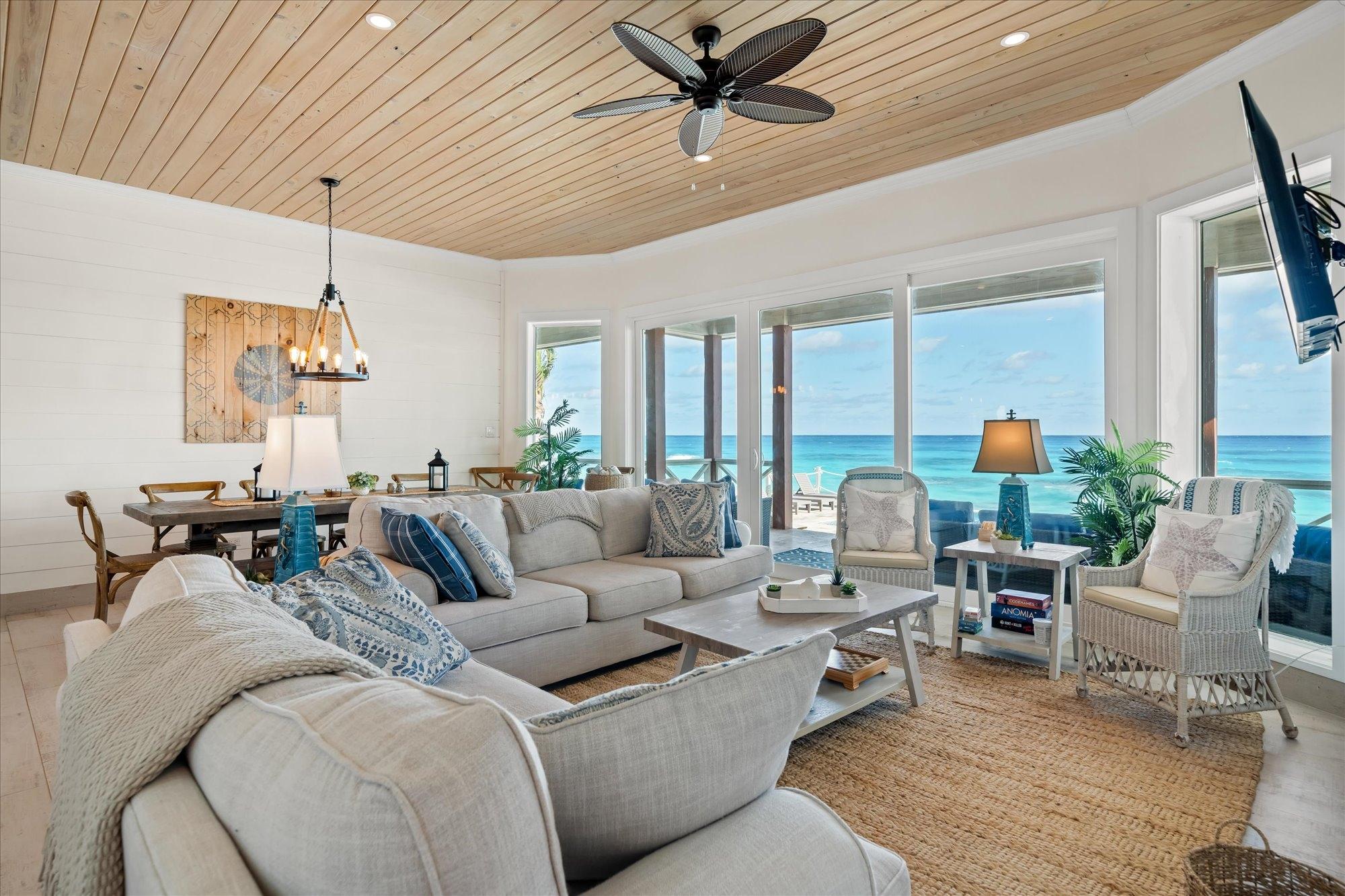 Adjacent to Treasure Cove, "Cerulean Sands" is a 1,750-square-foot, single-story home with four bedrooms and three-and-a-half bathrooms. It also features its own pool and hot tub along an expansive stretch of powdery white sand.