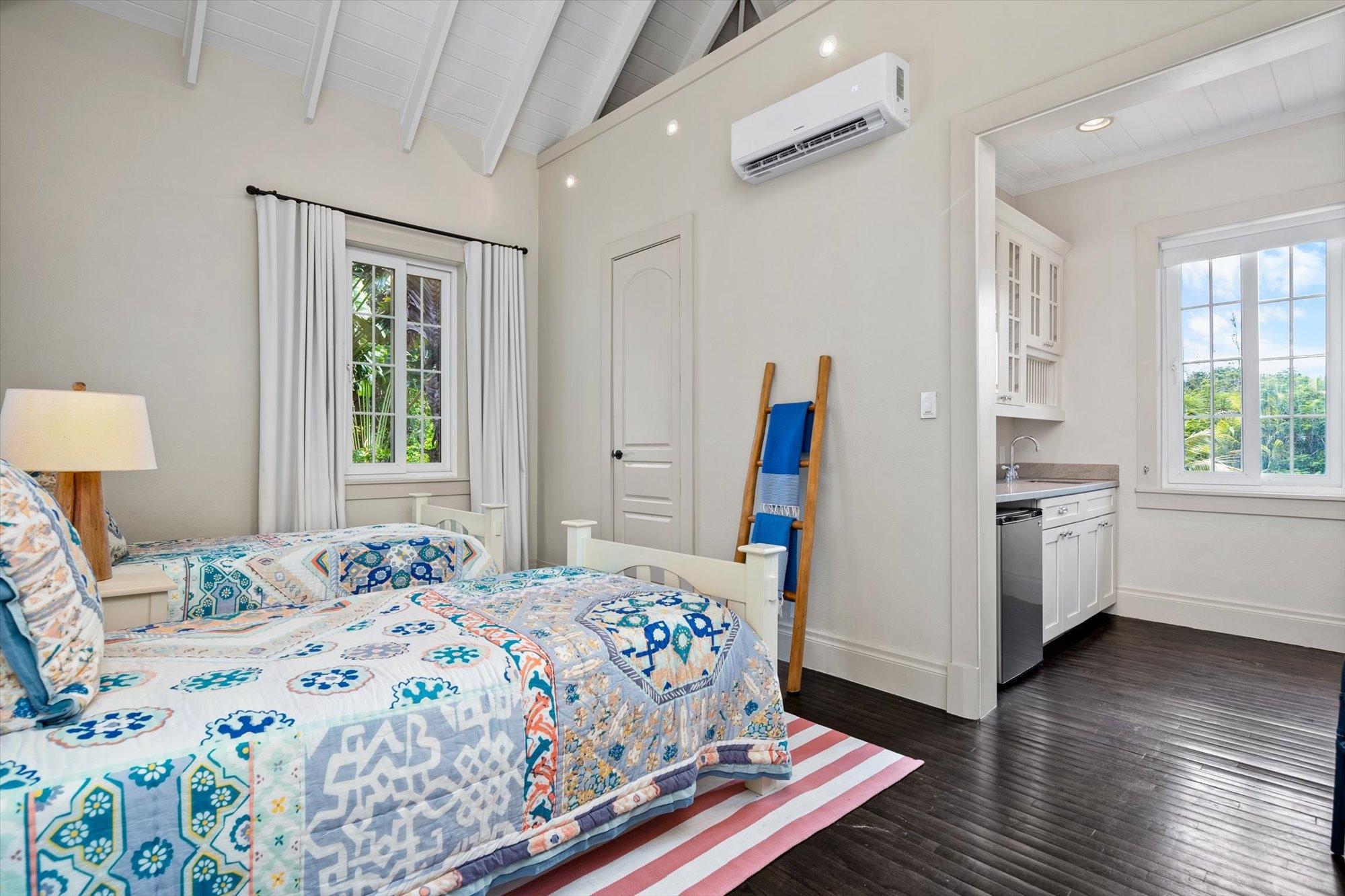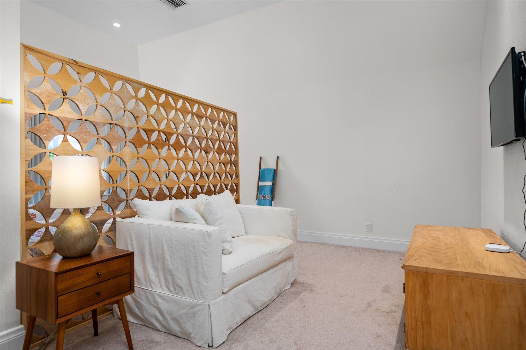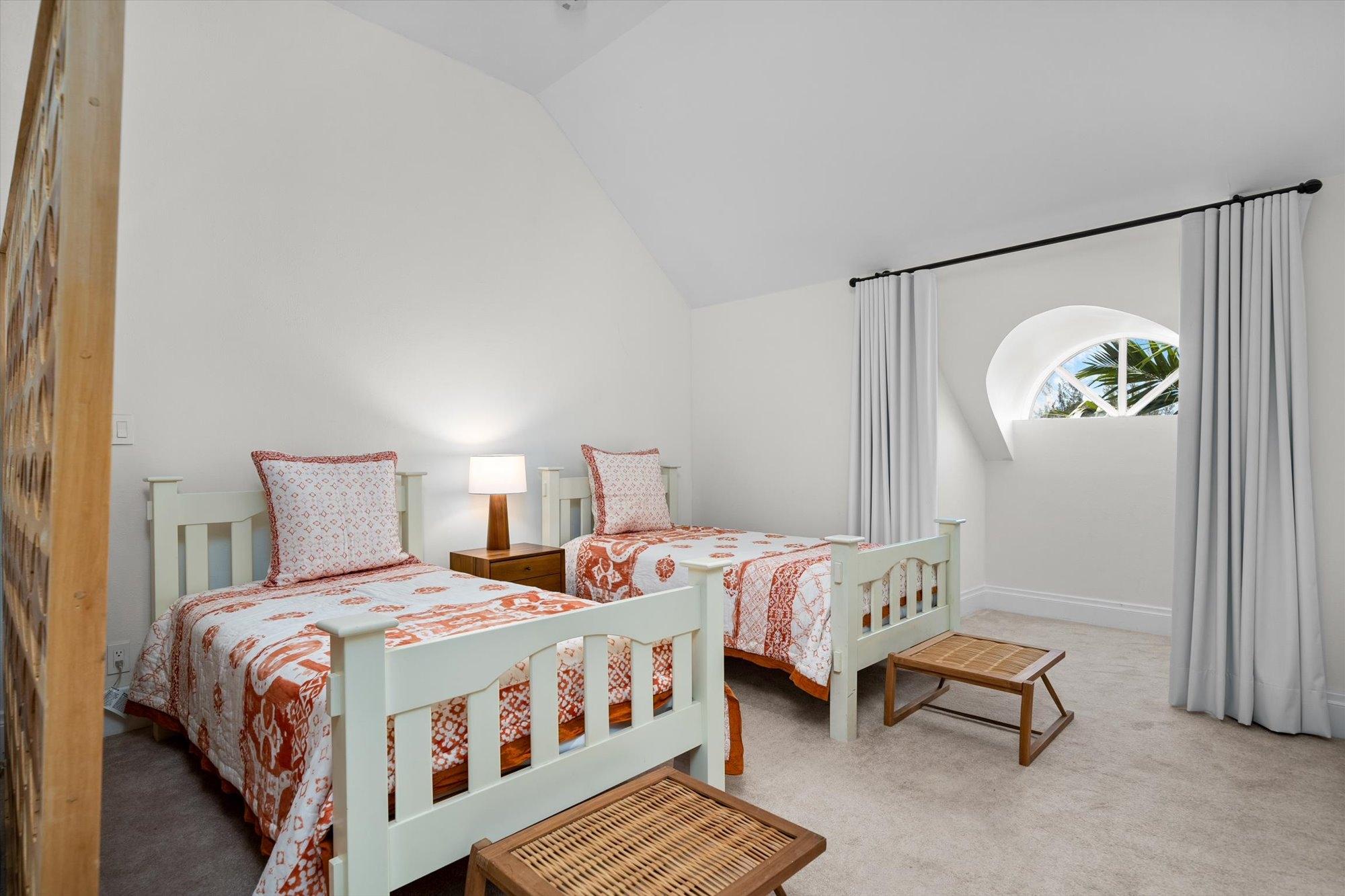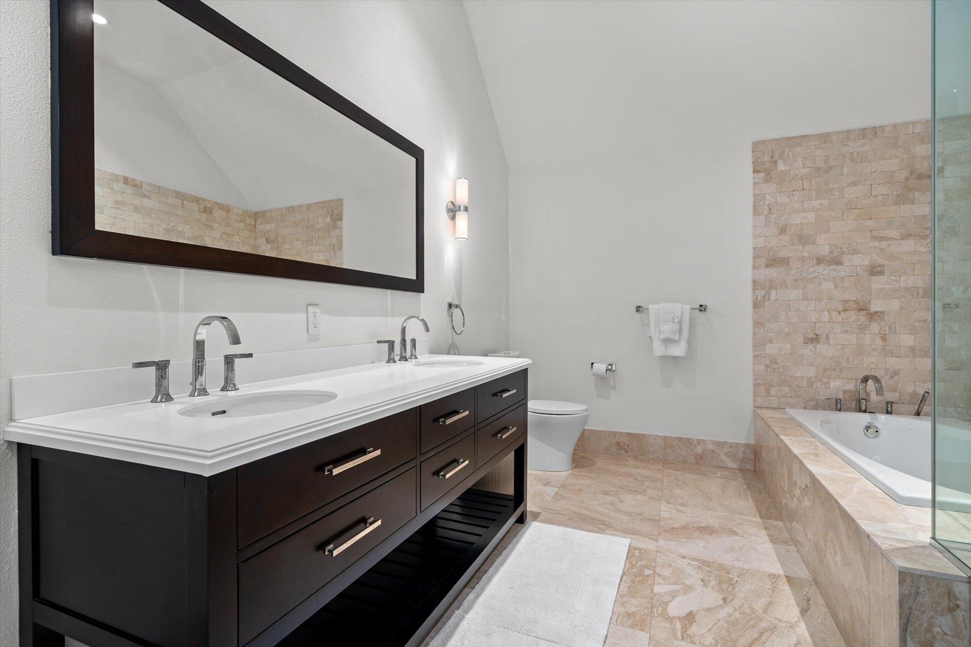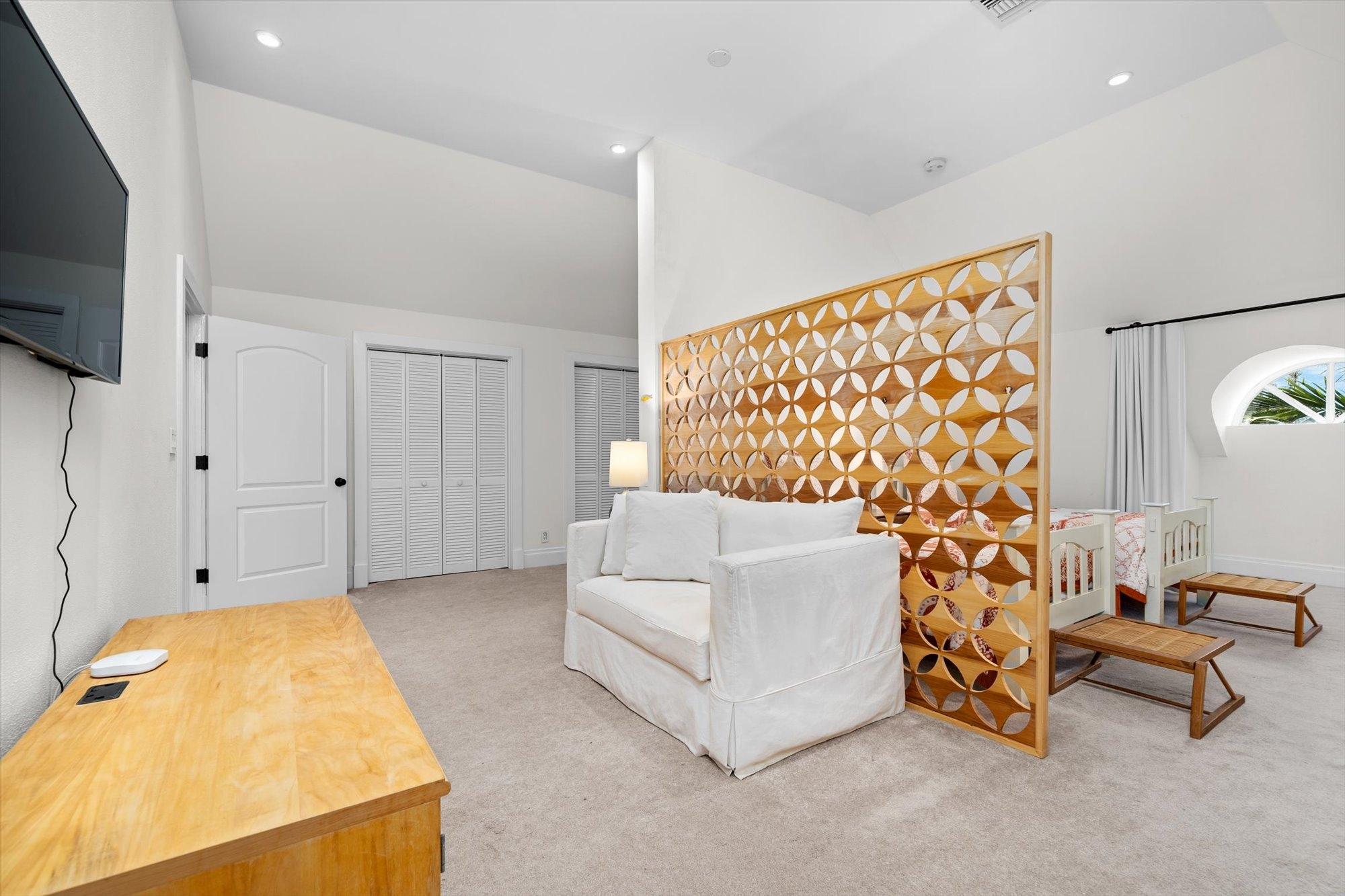The first level features a gourmet kitchen with state-of-the-art appliances, open-plan living and dining areas, a guest bedroom, and a guest bath. The second level boasts a lavish master suite with a walk-in closet, spa-like bath, and private deck, along with two additional ensuite guest bedrooms. The third level includes a spacious playroom and another guest suite.