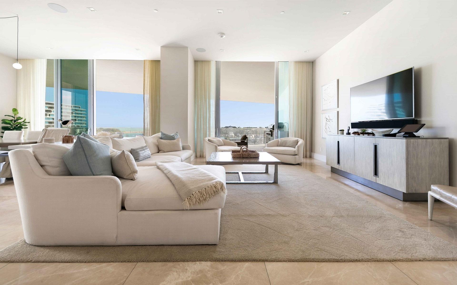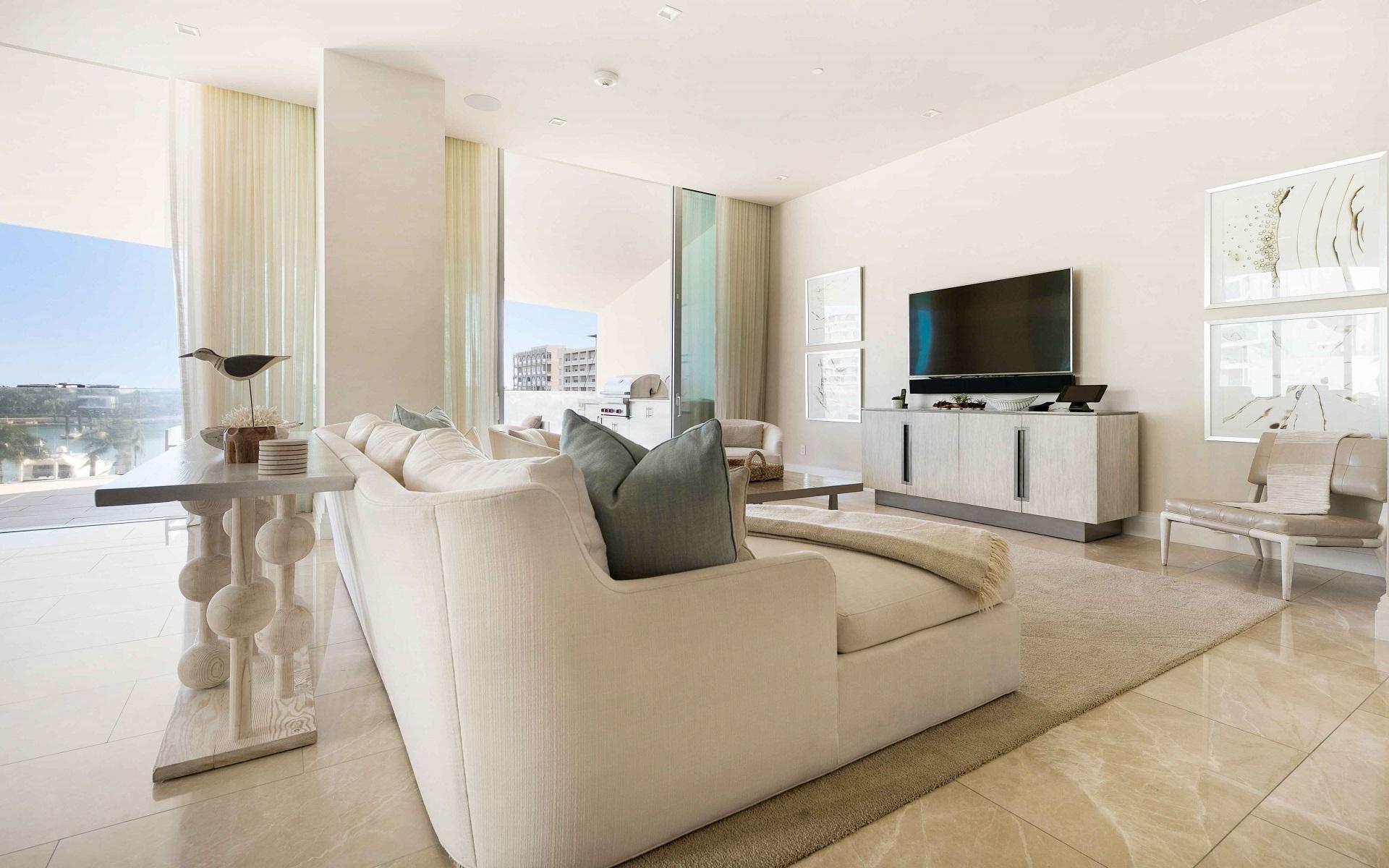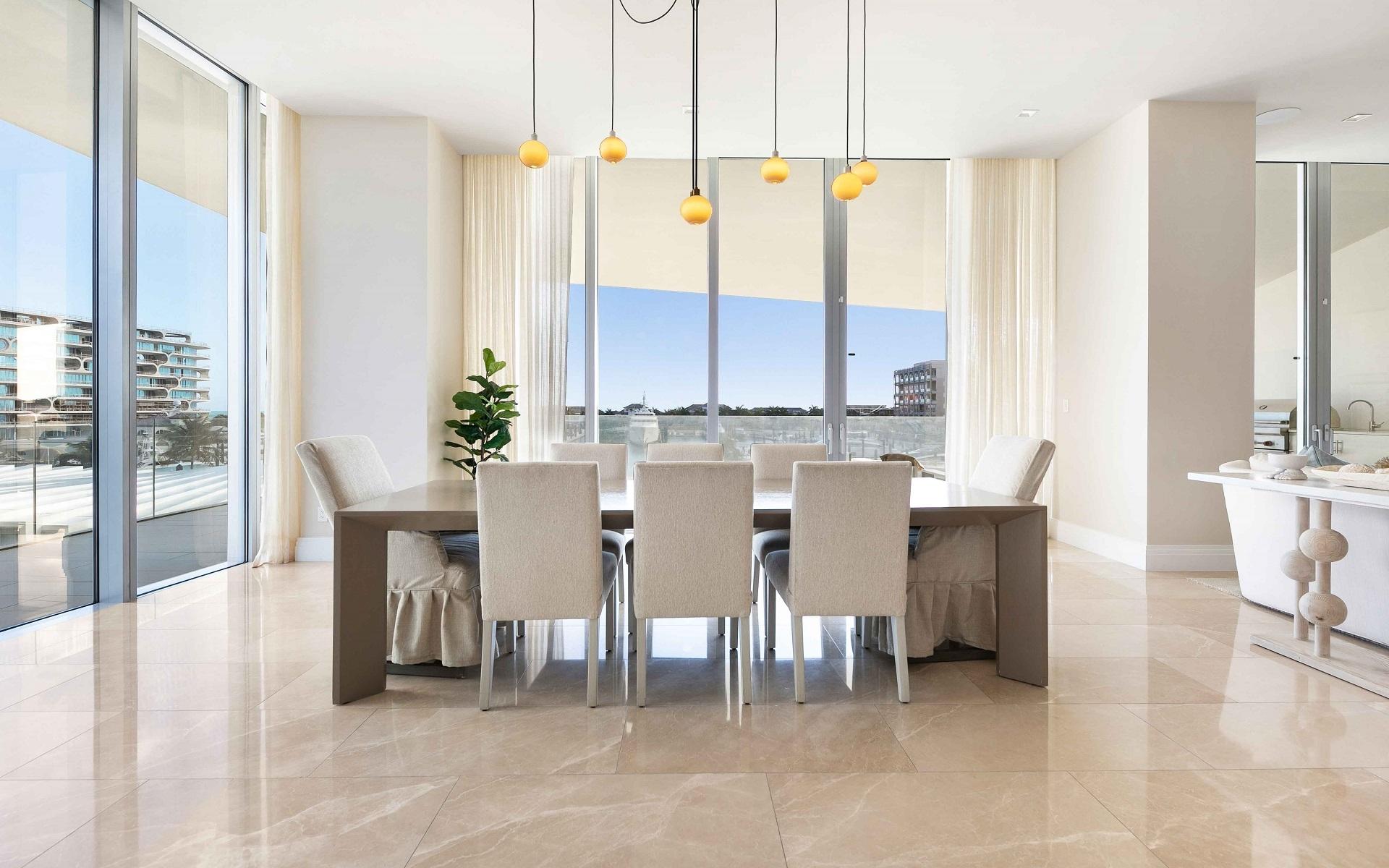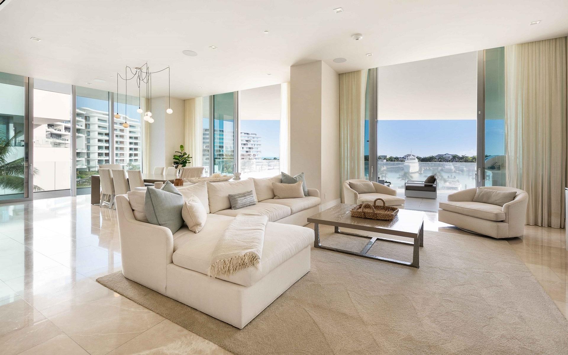 The open floor plan features luxurious Crema Botticino floors, a designer kitchen with quartz countertops, and top-tier Sub-Zero and Wolf appliances. Floor-to-ceiling windows lead to an expansive wraparound terrace overlooking the state-of-the-art 71-slip mega yacht marina and turquoise waters.