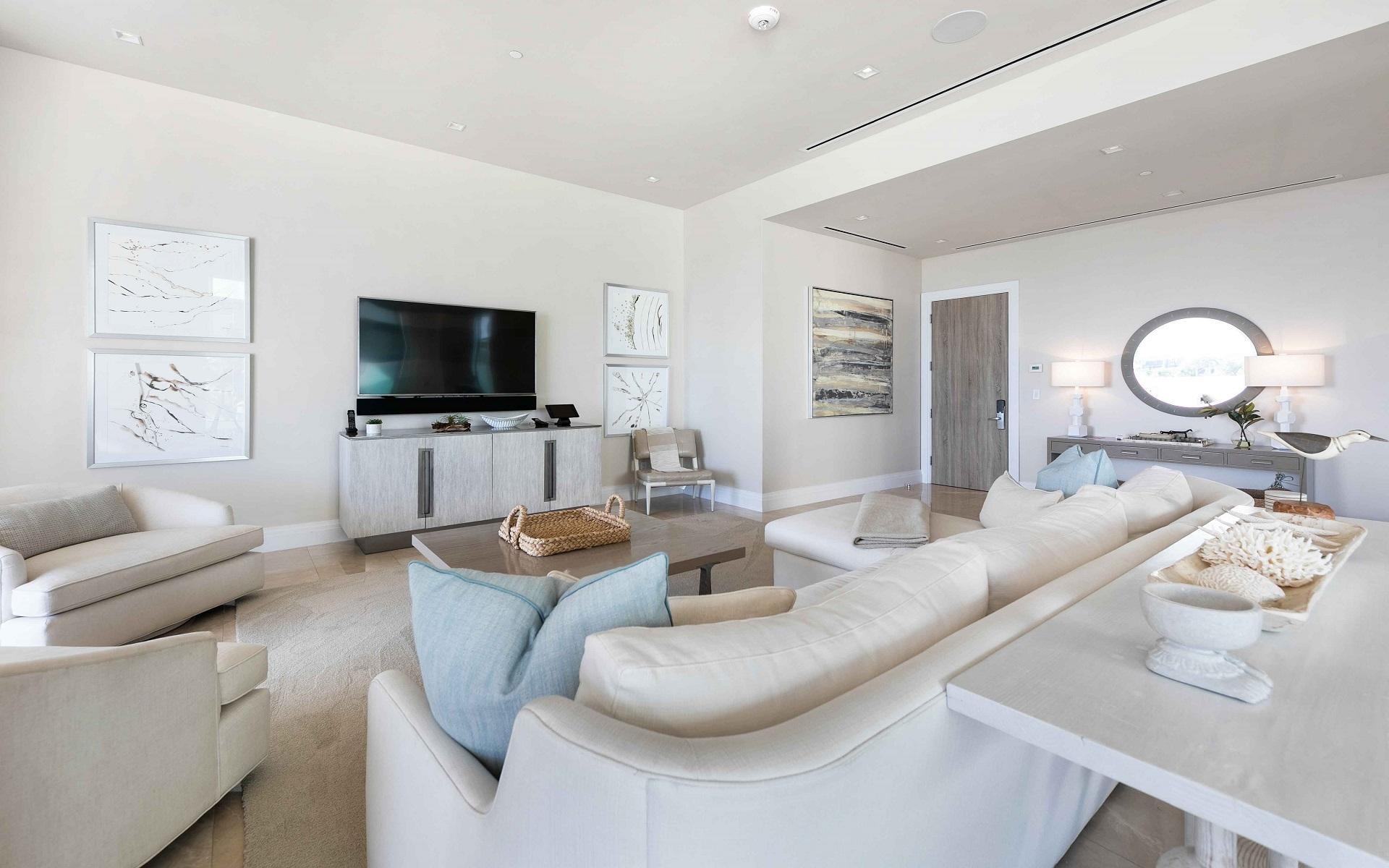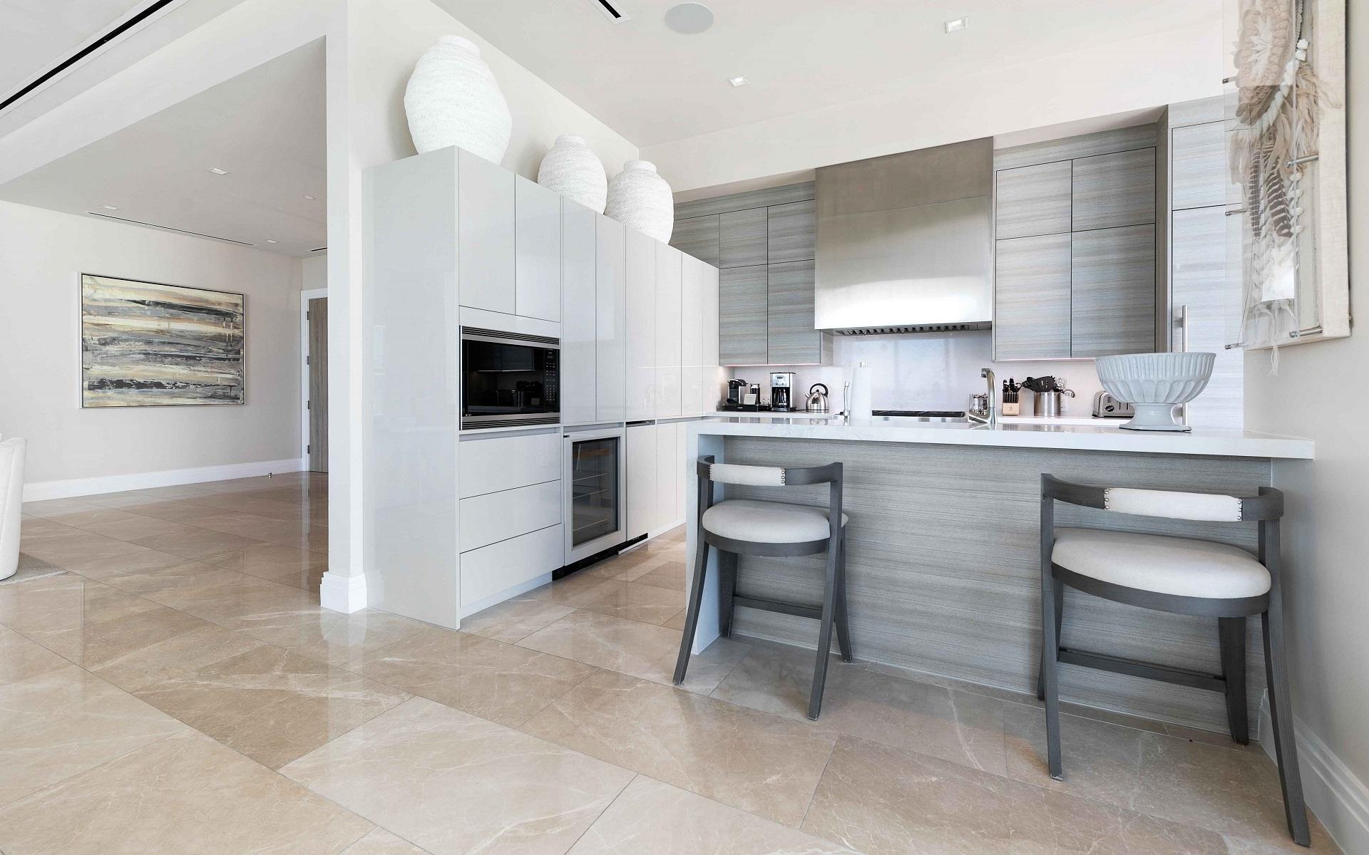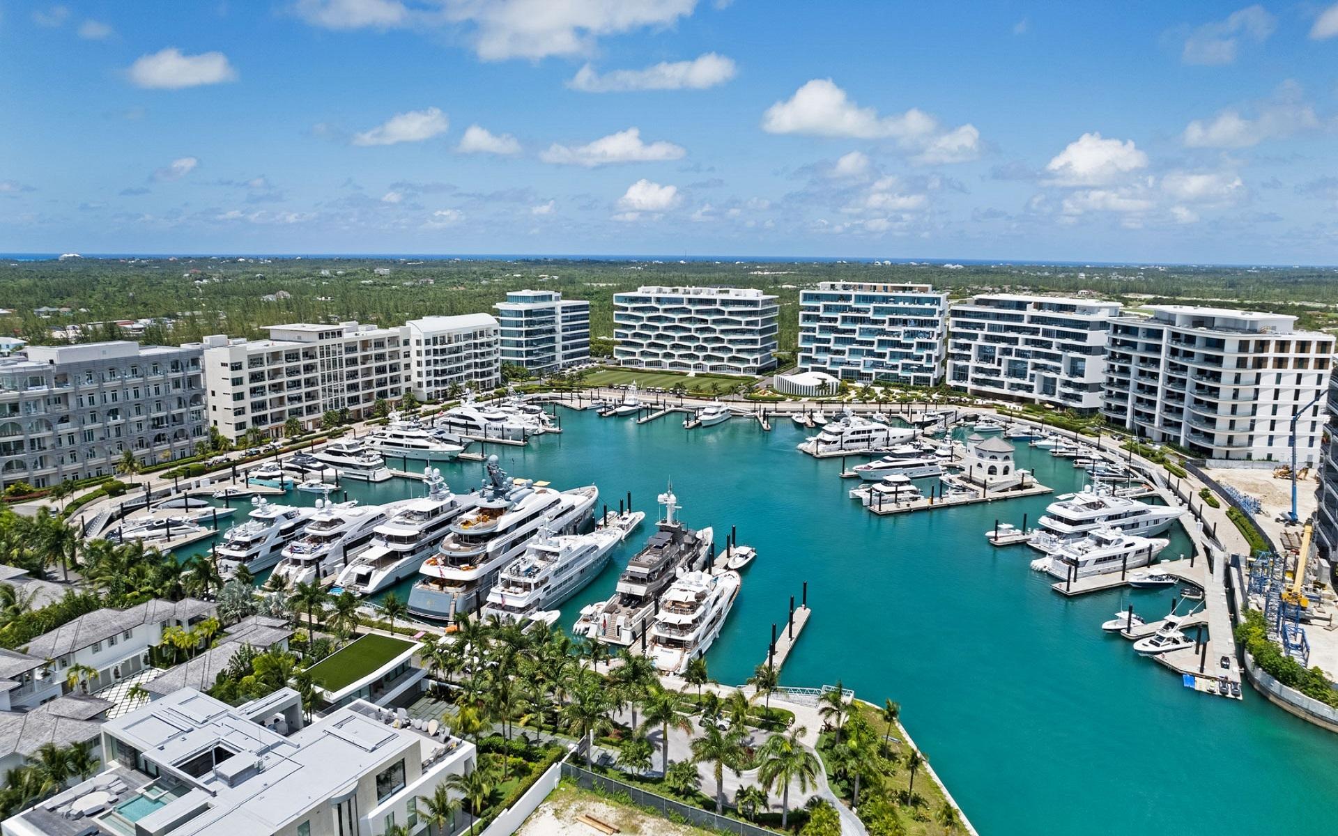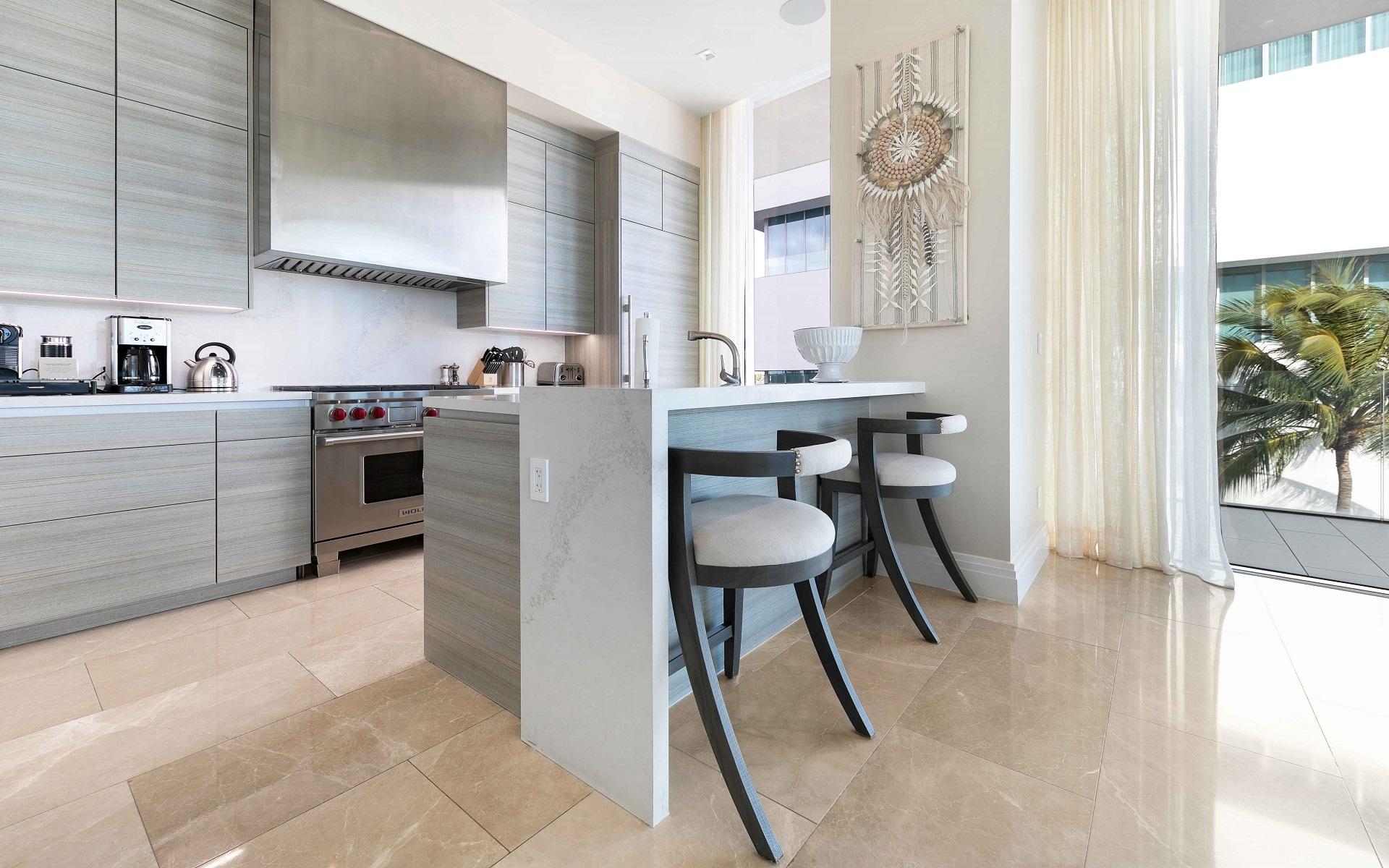 The open floor plan features luxurious Crema Botticino floors, a designer kitchen with quartz countertops, and top-tier Sub-Zero and Wolf appliances. Floor-to-ceiling windows lead to an expansive wraparound terrace overlooking the state-of-the-art 71-slip mega yacht marina and turquoise waters.