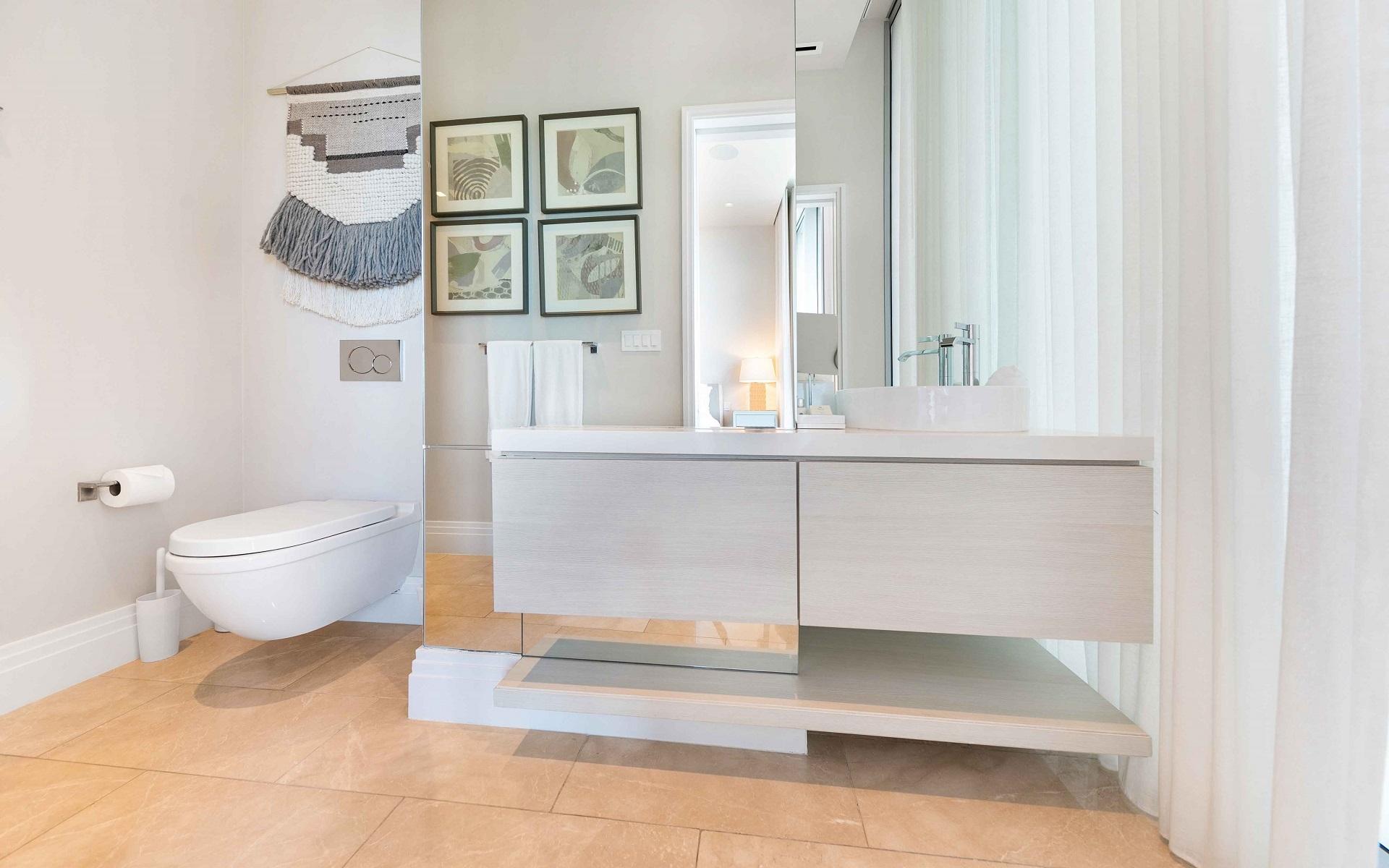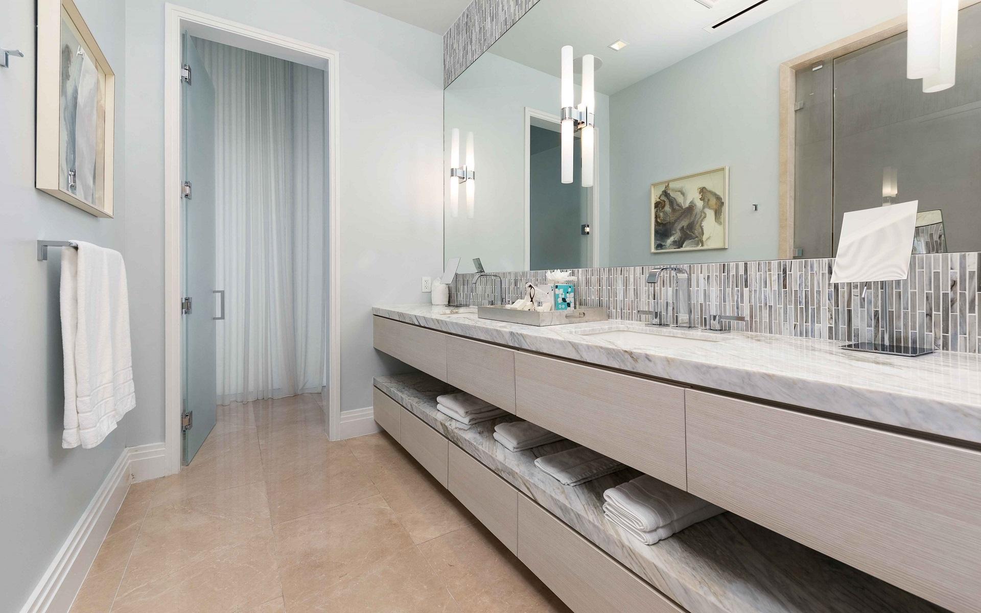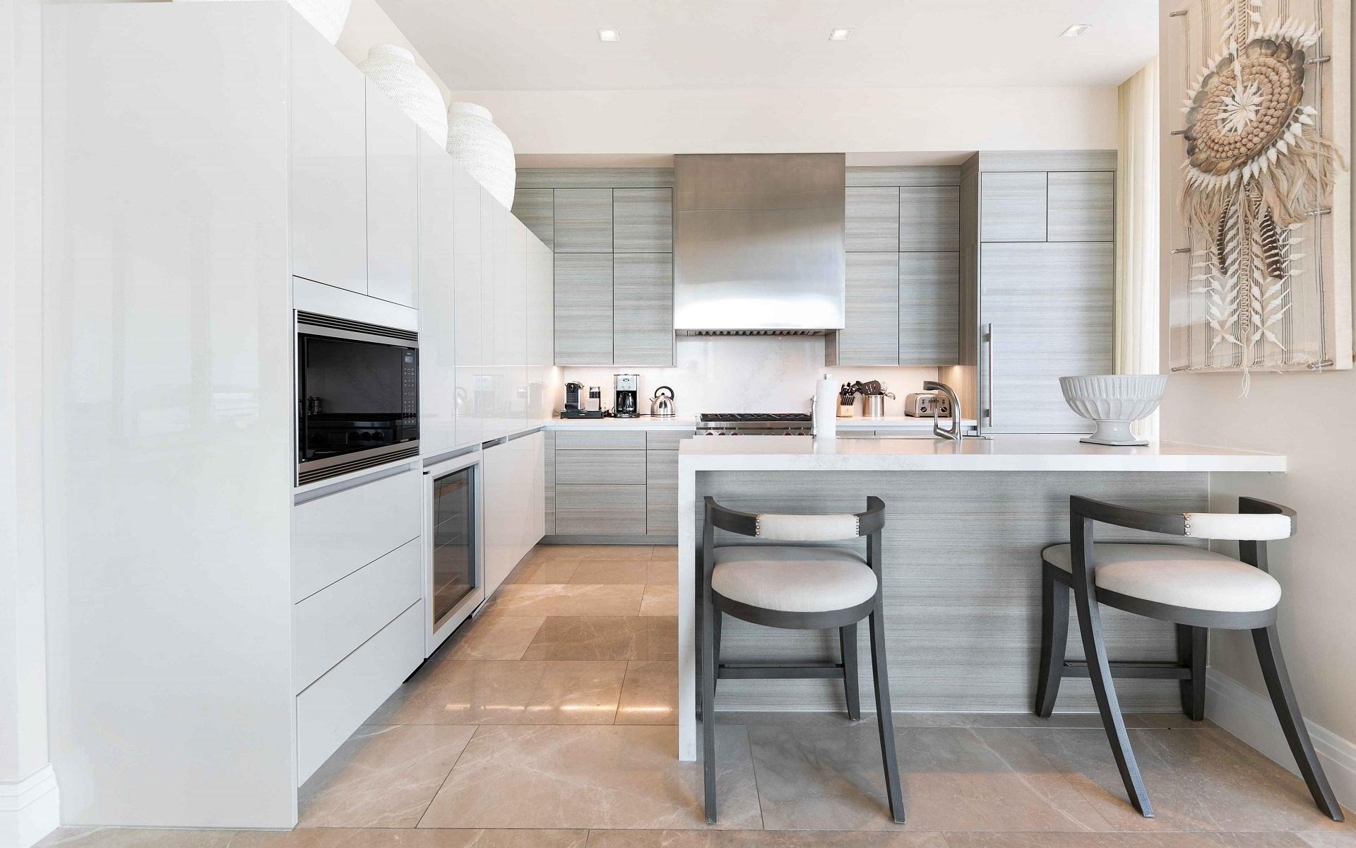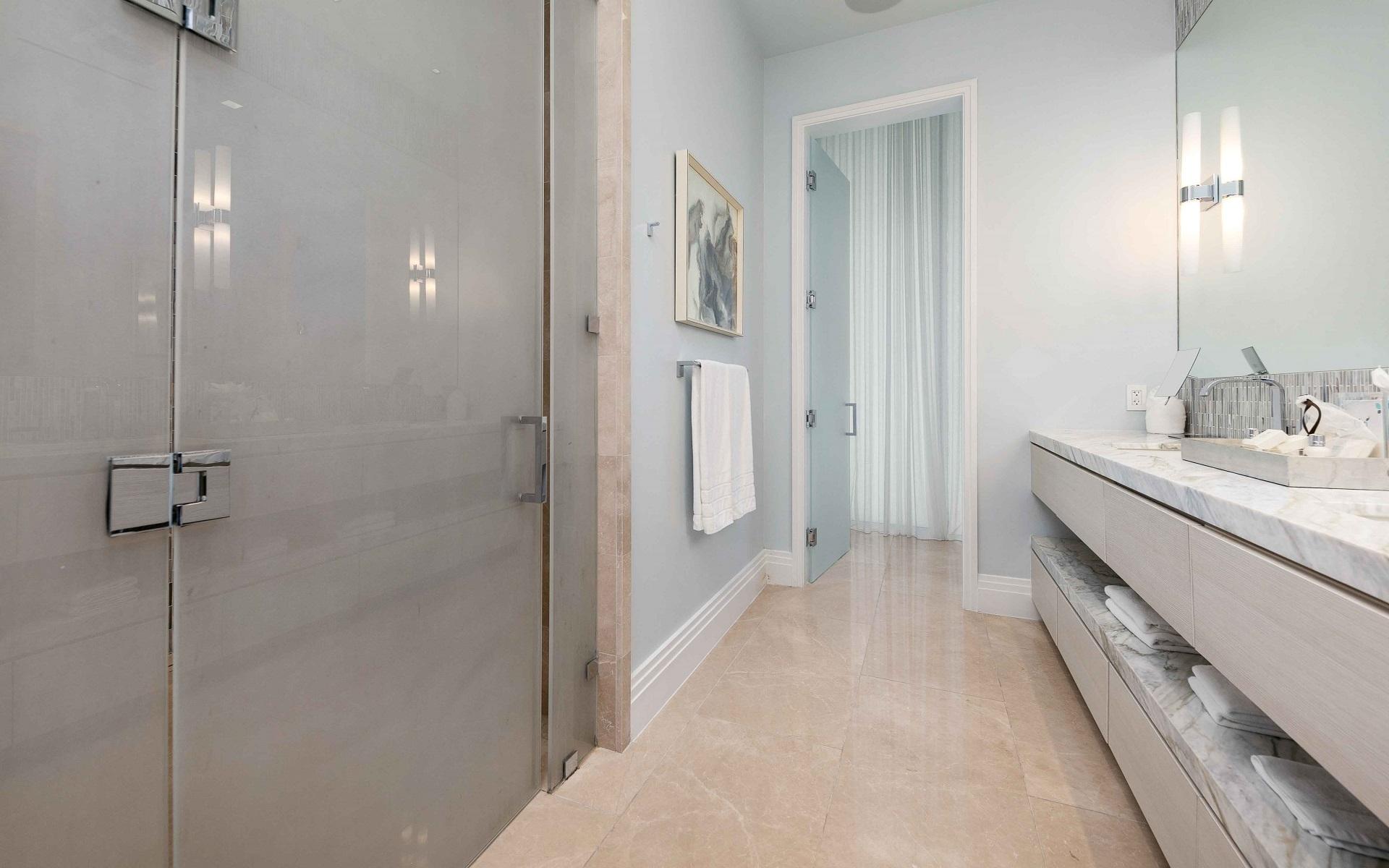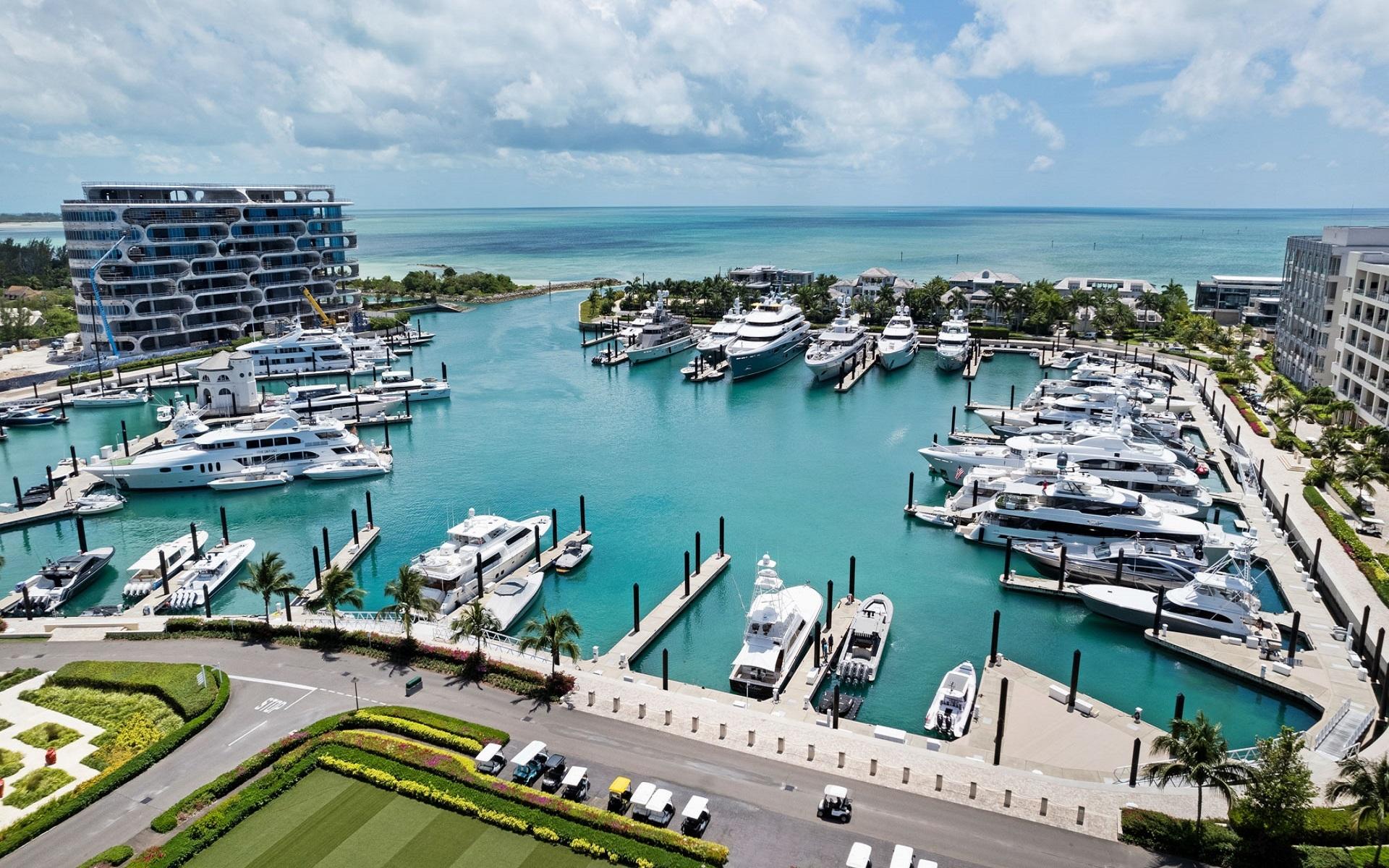 The open floor plan features luxurious Crema Botticino floors, a designer kitchen with quartz countertops, and top-tier Sub-Zero and Wolf appliances. Floor-to-ceiling windows lead to an expansive wraparound terrace overlooking the state-of-the-art 71-slip mega yacht marina and turquoise waters.