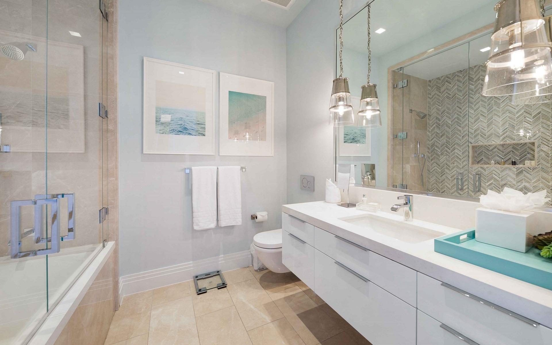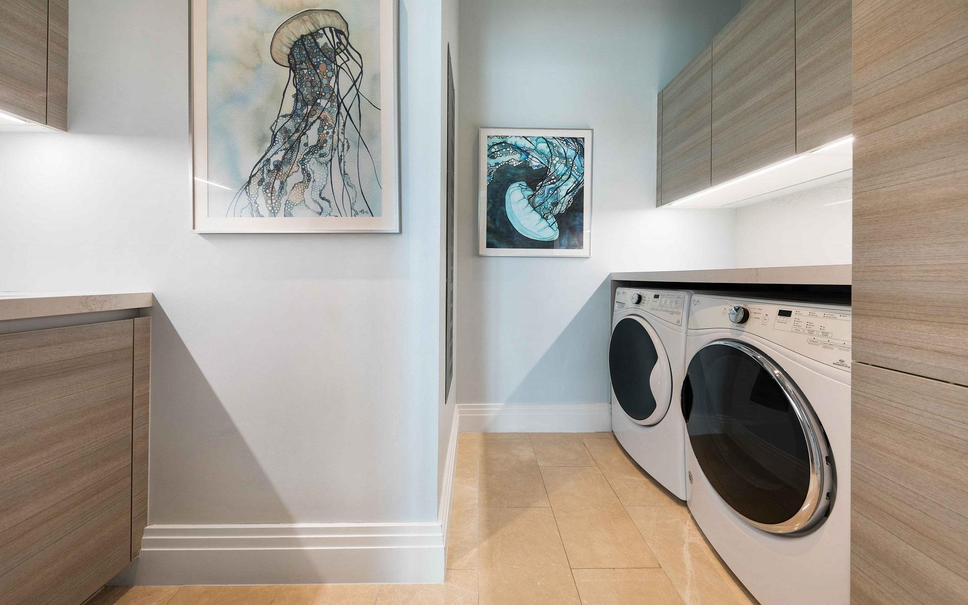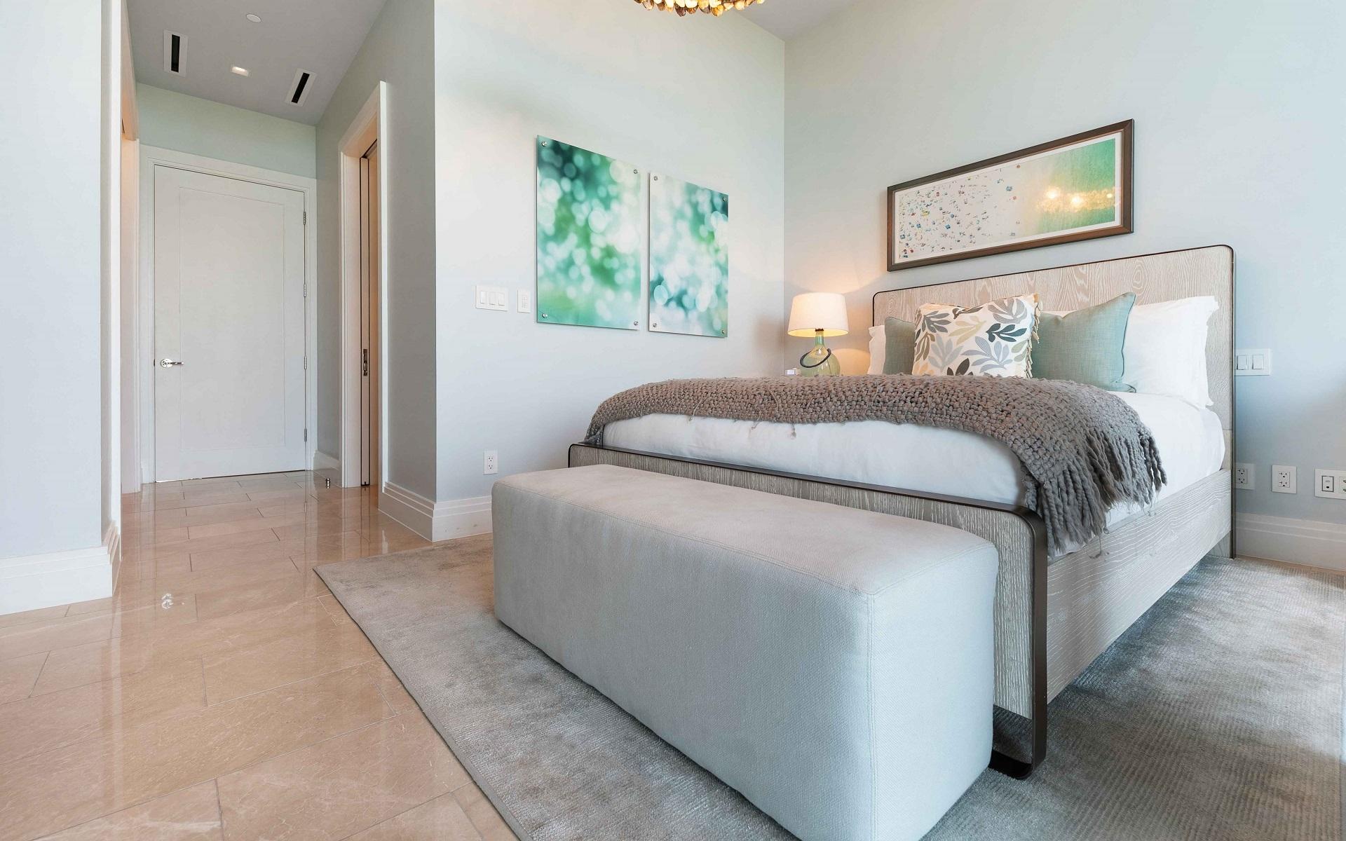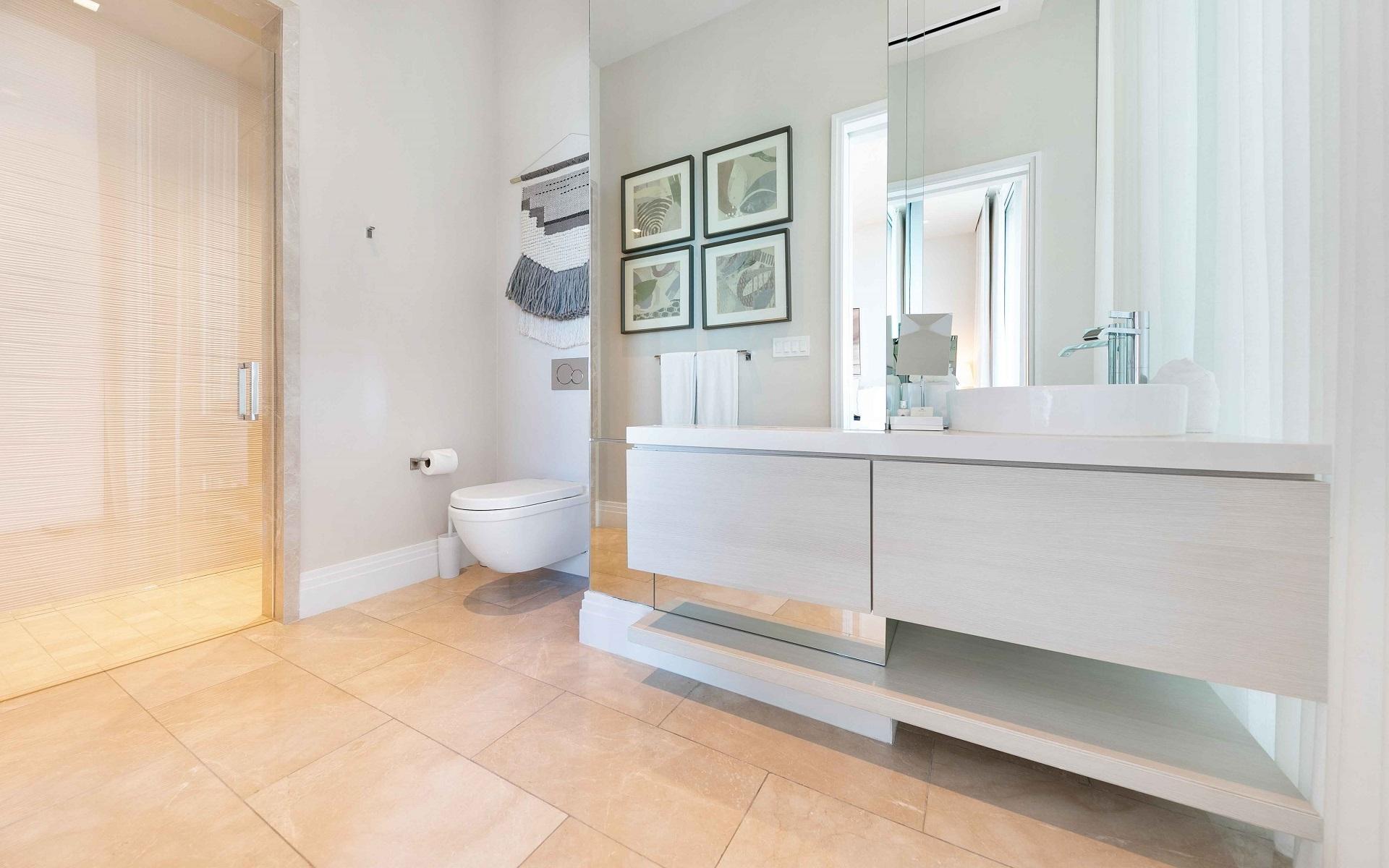The open floor plan features luxurious Crema Botticino floors, a designer kitchen with quartz countertops, and top-tier Sub-Zero and Wolf appliances. Floor-to-ceiling windows lead to an expansive wraparound terrace overlooking the state-of-the-art 71-slip mega yacht marina and turquoise waters.