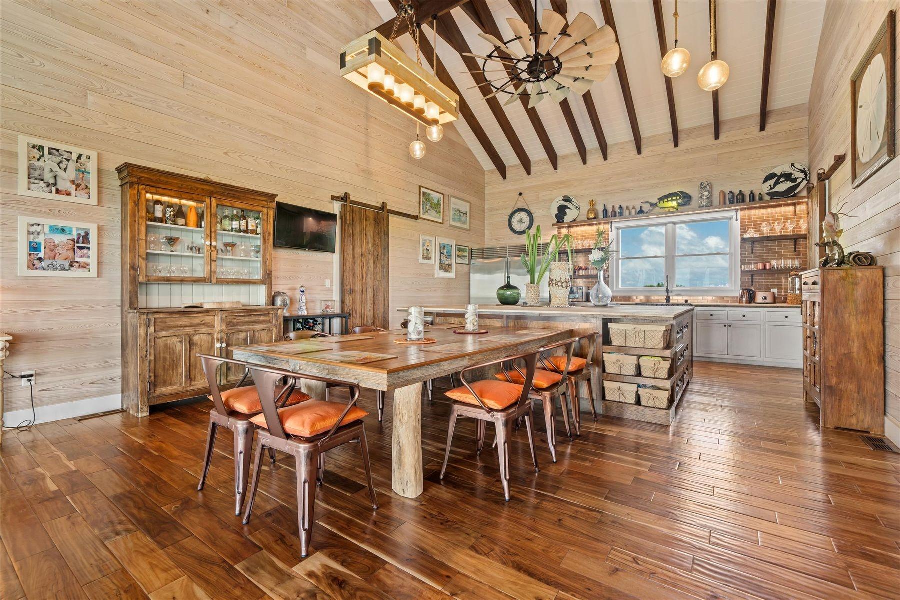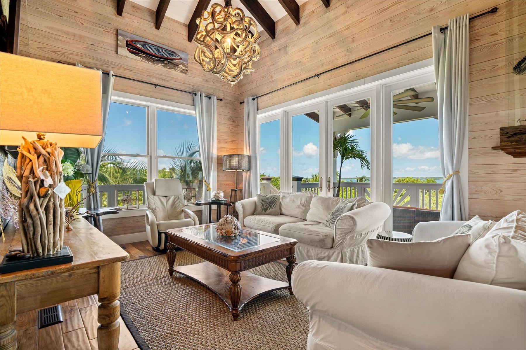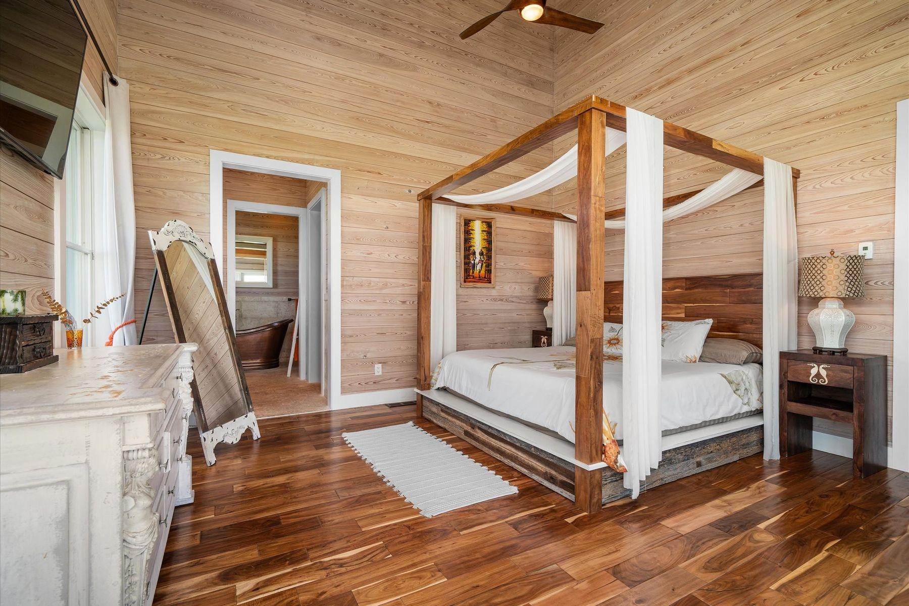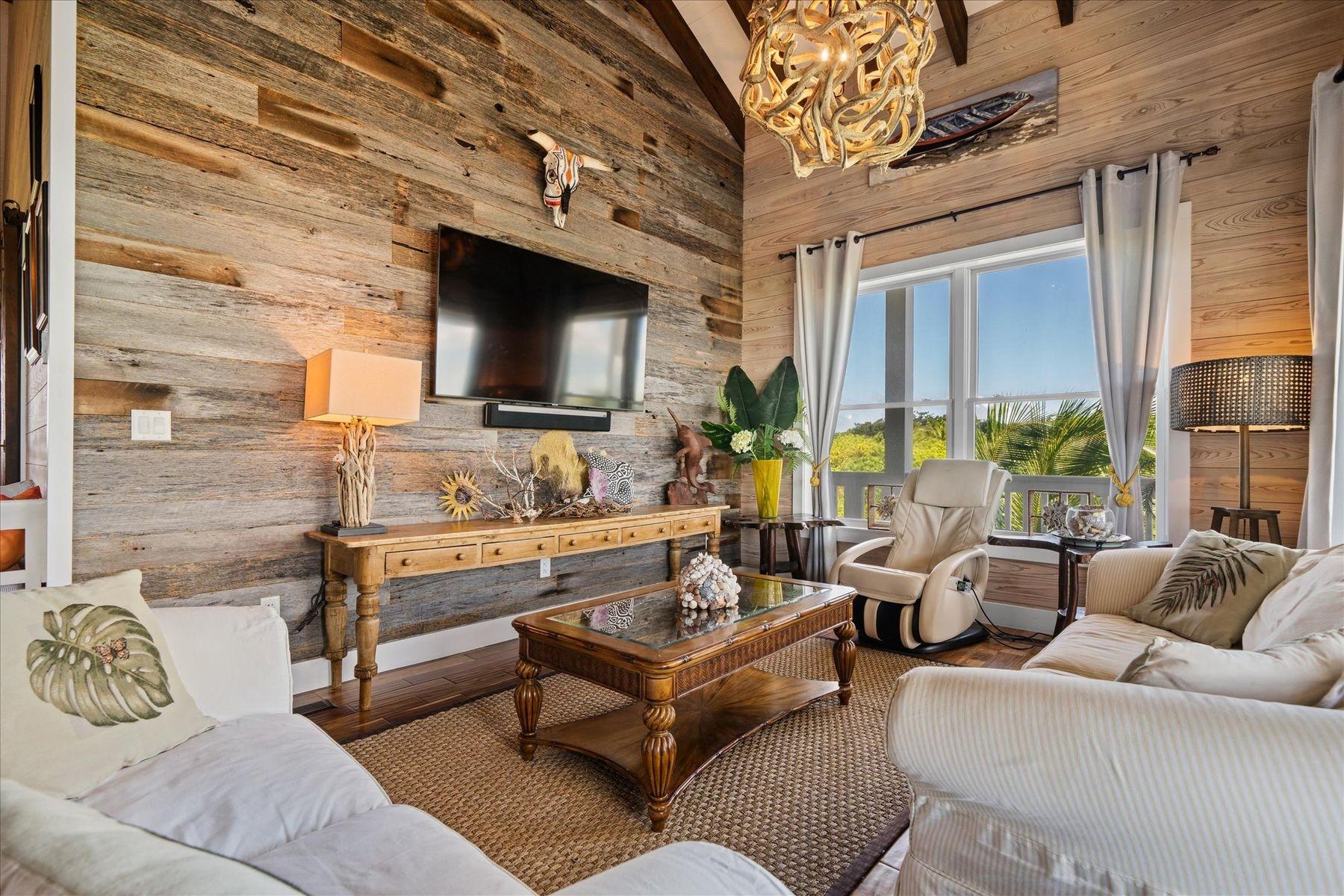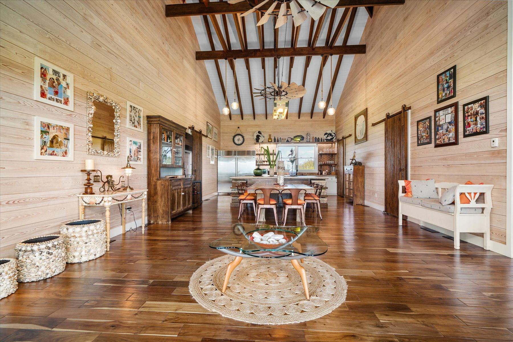 The interiors boast cypress ceilings, coral stone countertops, and acacia wood flooring, creating a warm and refined atmosphere. Outdoors, enjoy a 1,500 sq. ft. covered deck, landscaped garden, large pool, fire pit, and grill and bar area—perfect for entertaining or relaxing in paradise.