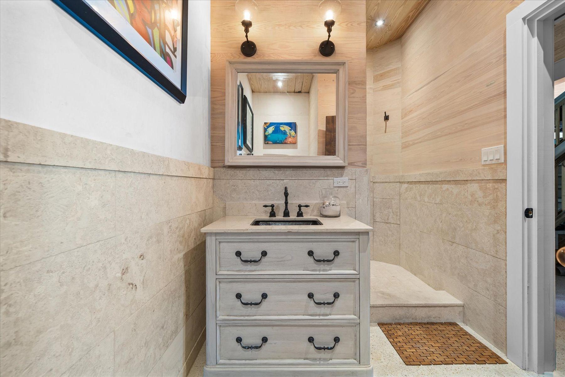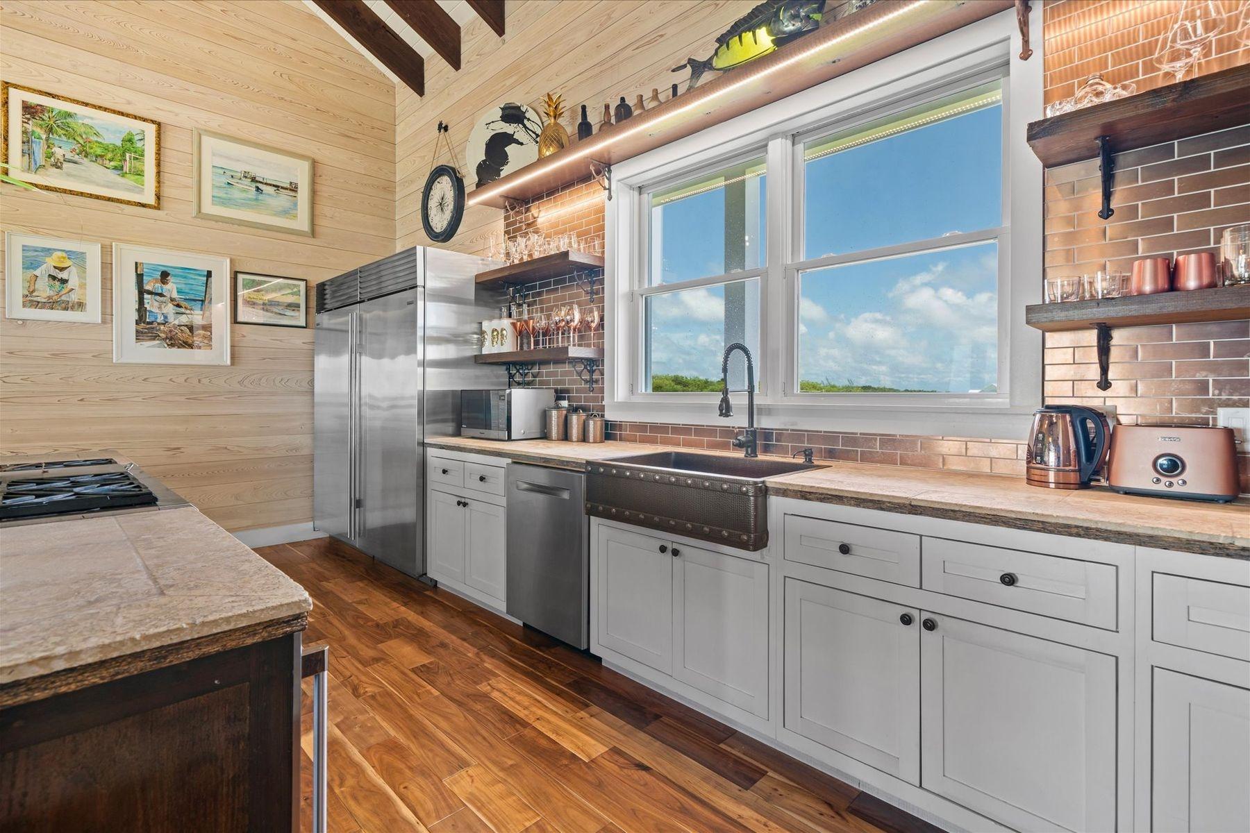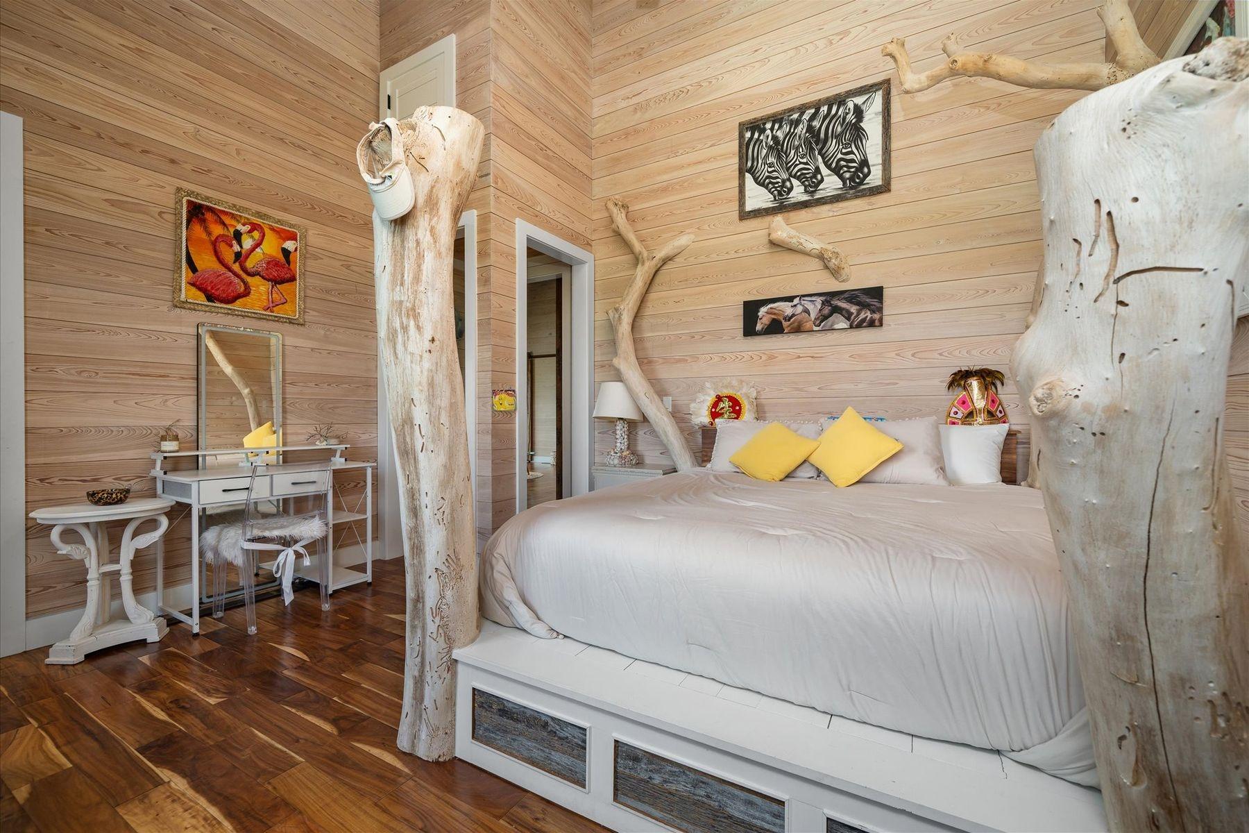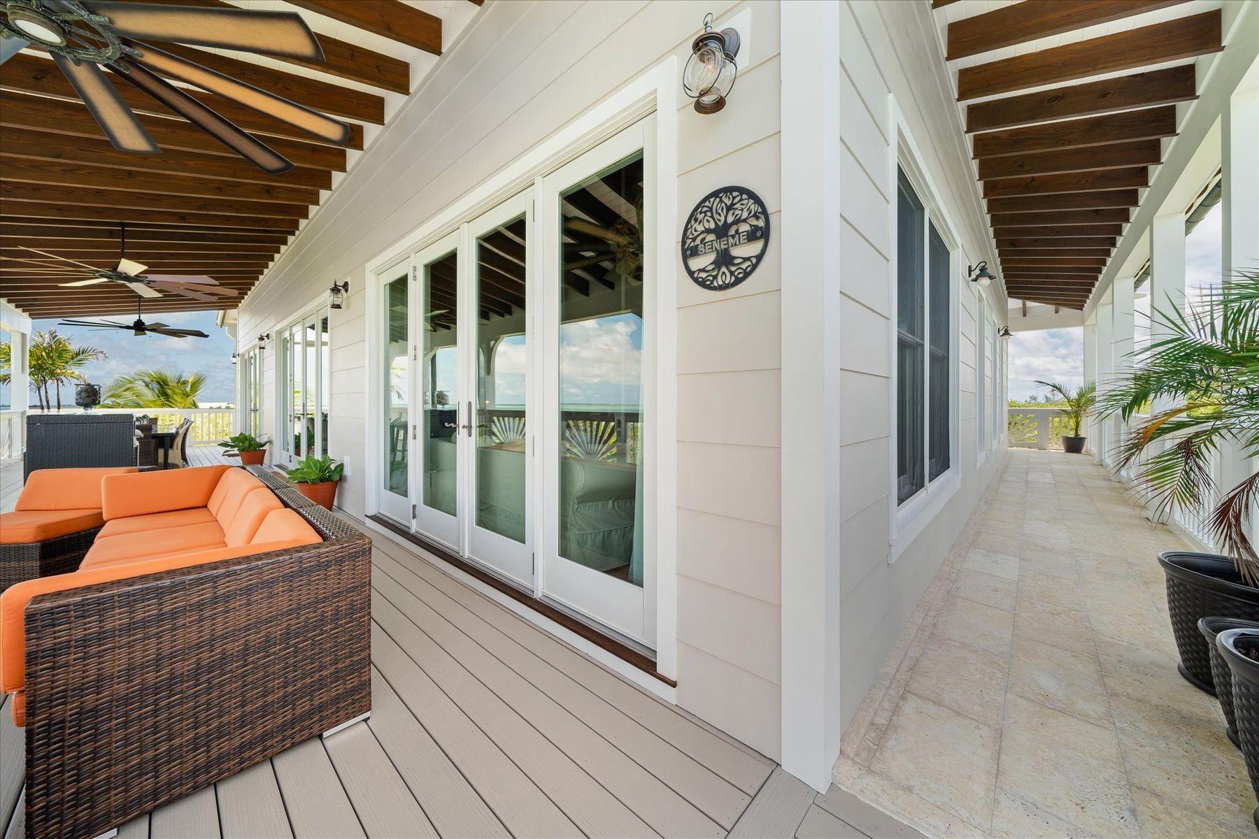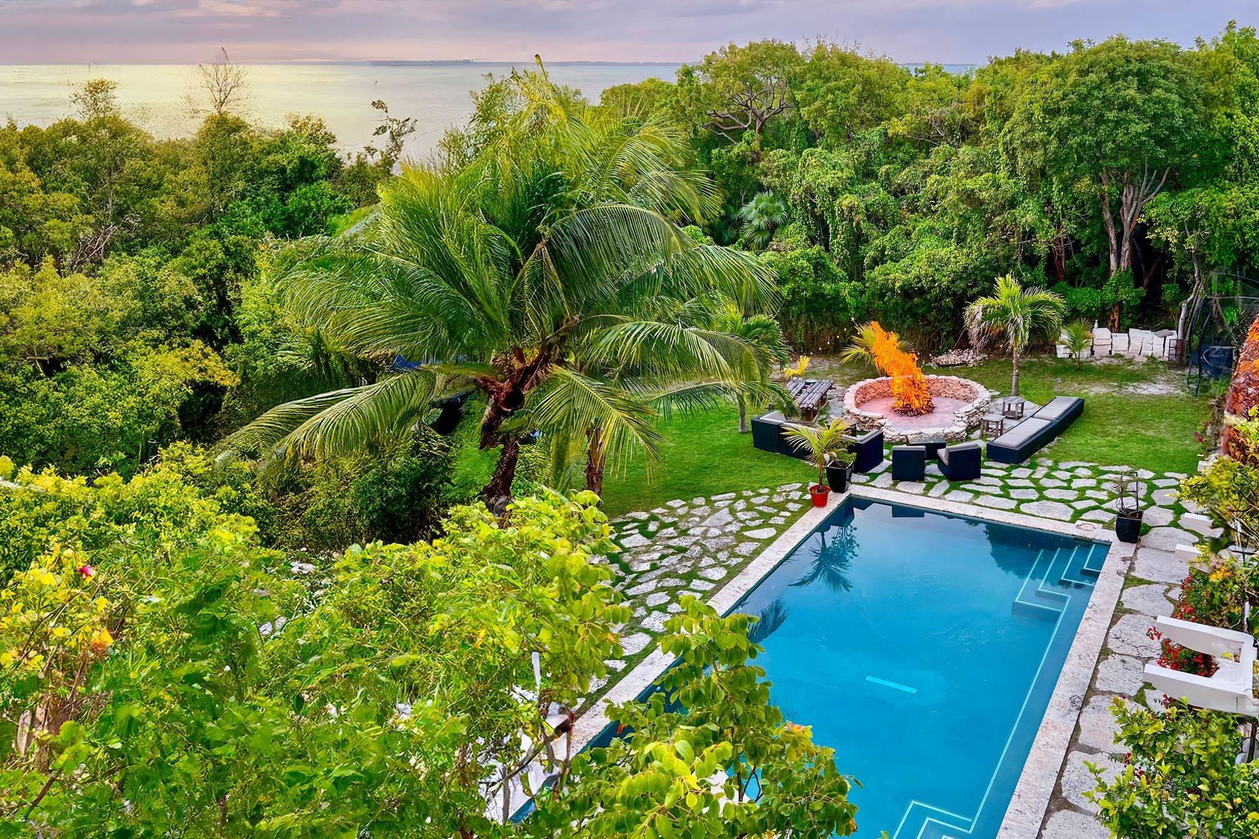 The interiors boast cypress ceilings, coral stone countertops, and acacia wood flooring, creating a warm and refined atmosphere. Outdoors, enjoy a 1,500 sq. ft. covered deck, landscaped garden, large pool, fire pit, and grill and bar area—perfect for entertaining or relaxing in paradise.